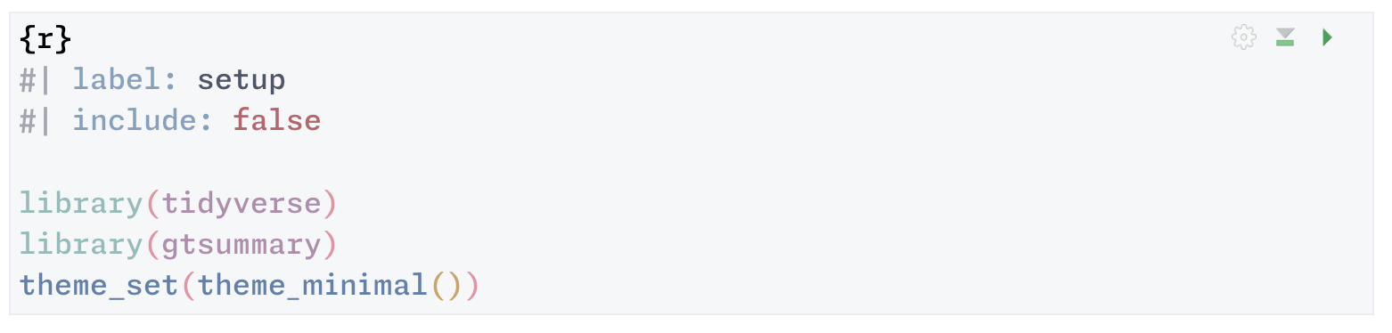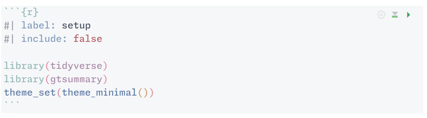You can run the whole chunk at once with the green “play” button, or run line-by-line with Cmd+Enter (Mac) or Ctrl+Enter (Windows)
