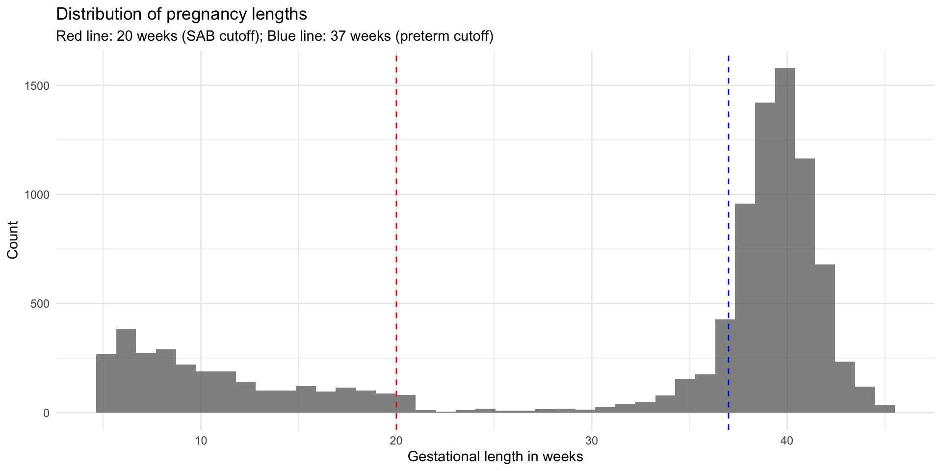 subtitle = "Red line: 20 weeks (SAB cutoff); Blue line: 37 weeks (preterm cutoff)"